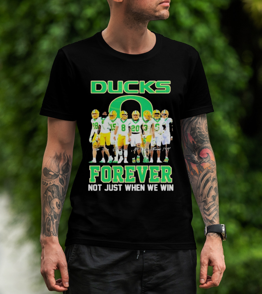 The DUCKS O Forever Not Just When We Win T-shirt is designed for everyday wear and a consistent fit. Fabric is pre-shrunk ring-spun cotton with durable stitching. See the size chart below for exact measurements.