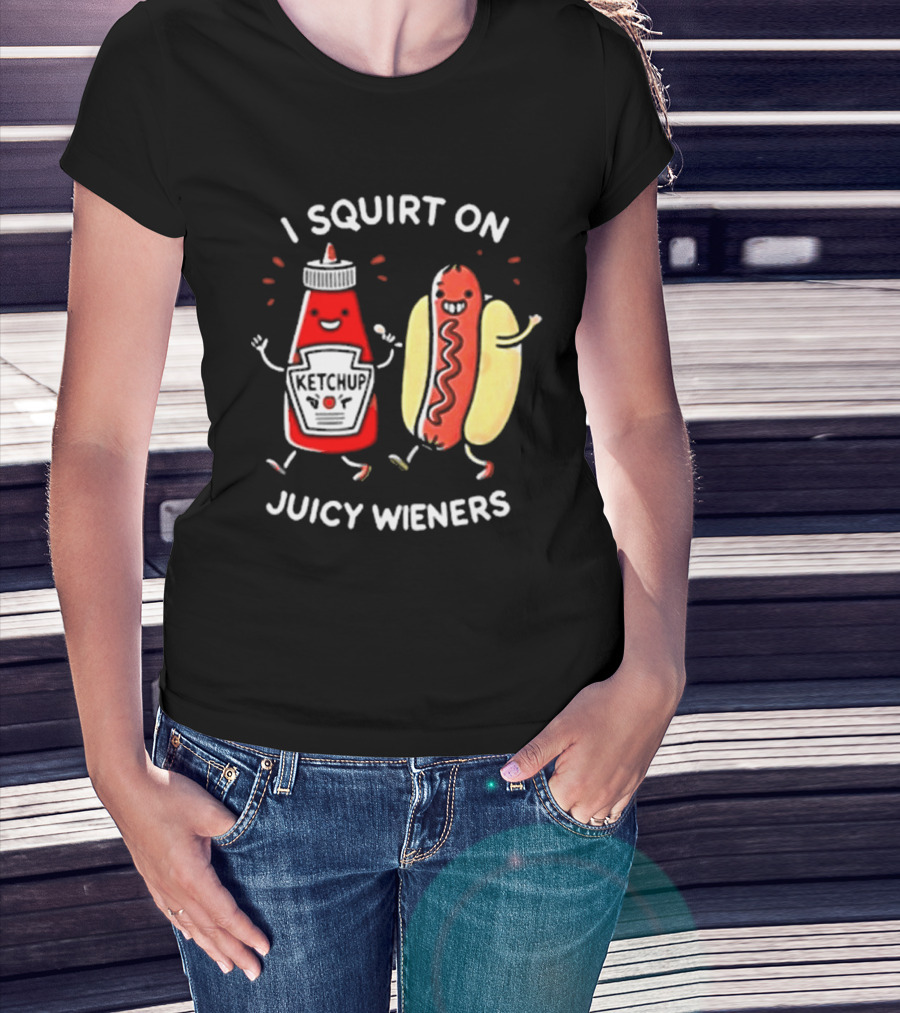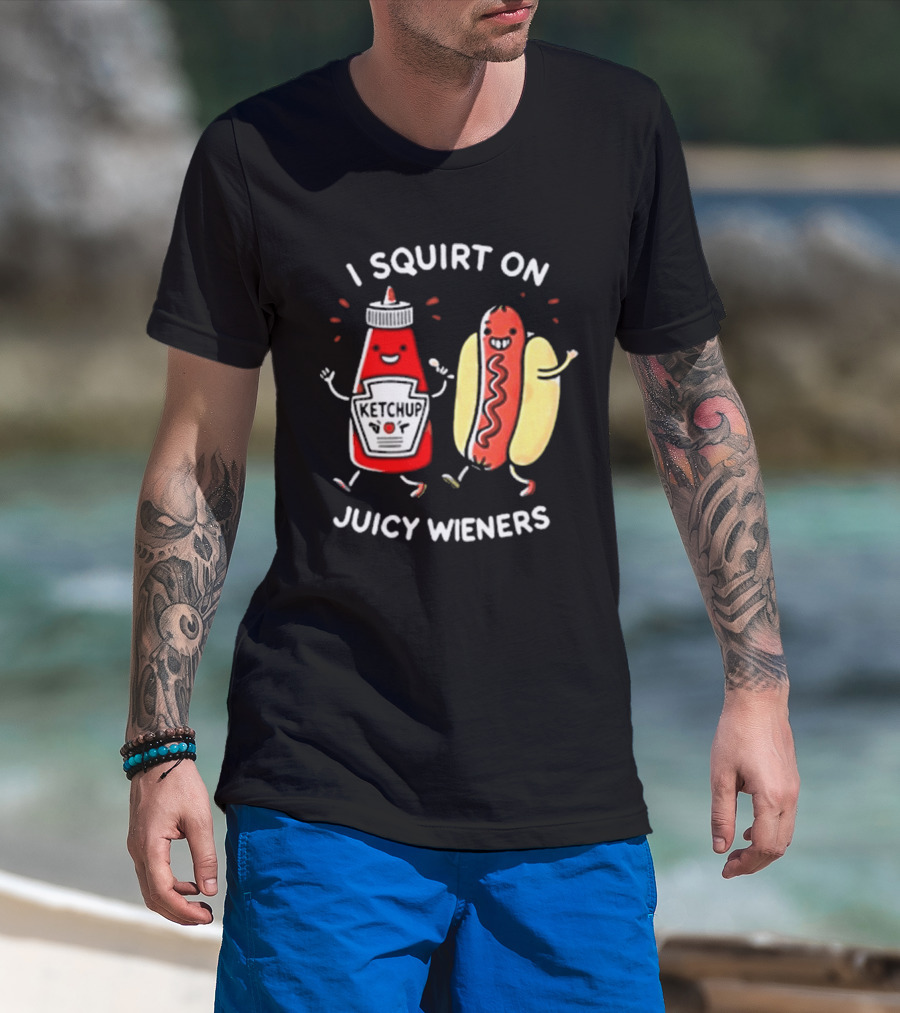 The I Squirt On Juicy Wieners T-shirt is designed for everyday wear and a consistent fit. Fabric is pre-shrunk ring-spun cotton with durable stitching. See the size chart below for exact measurements.