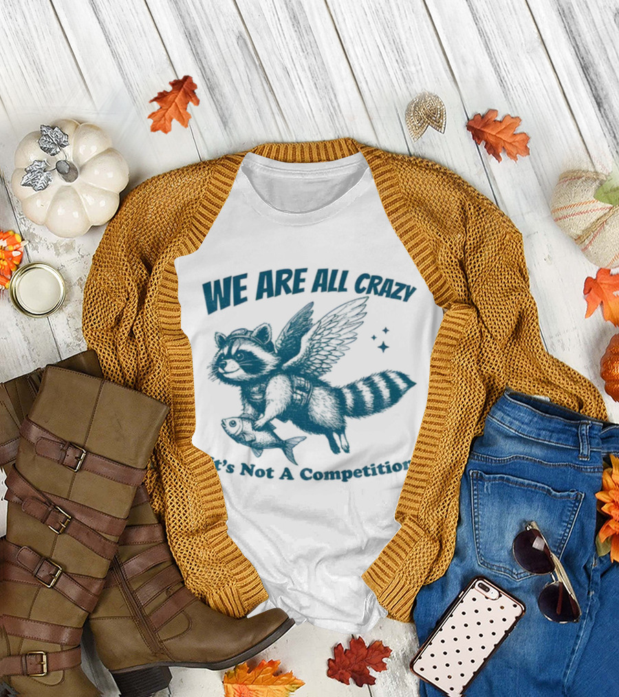 The Raccoon with Wings Holding Fish We Are All Crazy It's Not a Competition T-shirt is designed for everyday wear and a consistent fit. Fabric is pre-shrunk ring-spun cotton with durable stitching. See the size chart below for exact measurements.