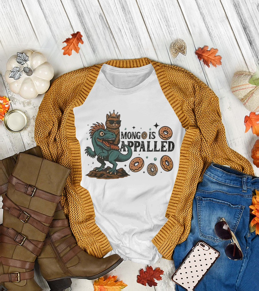 Cat With Crown Riding Dinosaur Among Flying Donuts Mongo Is Appalled T-Shirt