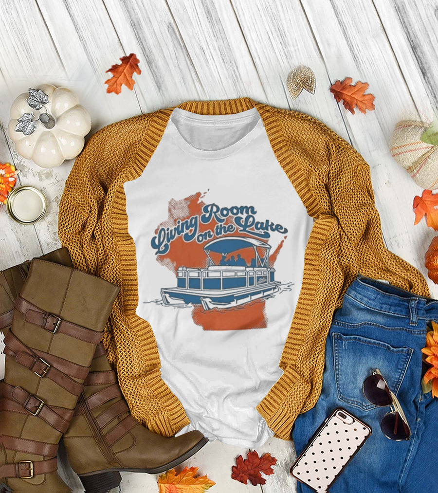 The Living Room On The Lake Drink Wisconsinbly Pontoon Boat Illustration T-shirt is designed for everyday wear and a consistent fit. Fabric is pre-shrunk ring-spun cotton with durable stitching. See the size chart below for exact measurements.