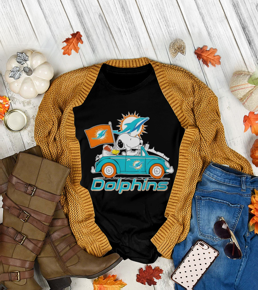 Miami Dolphins Snoopy Woodstock Driving With Flag And Logo T-Shirt