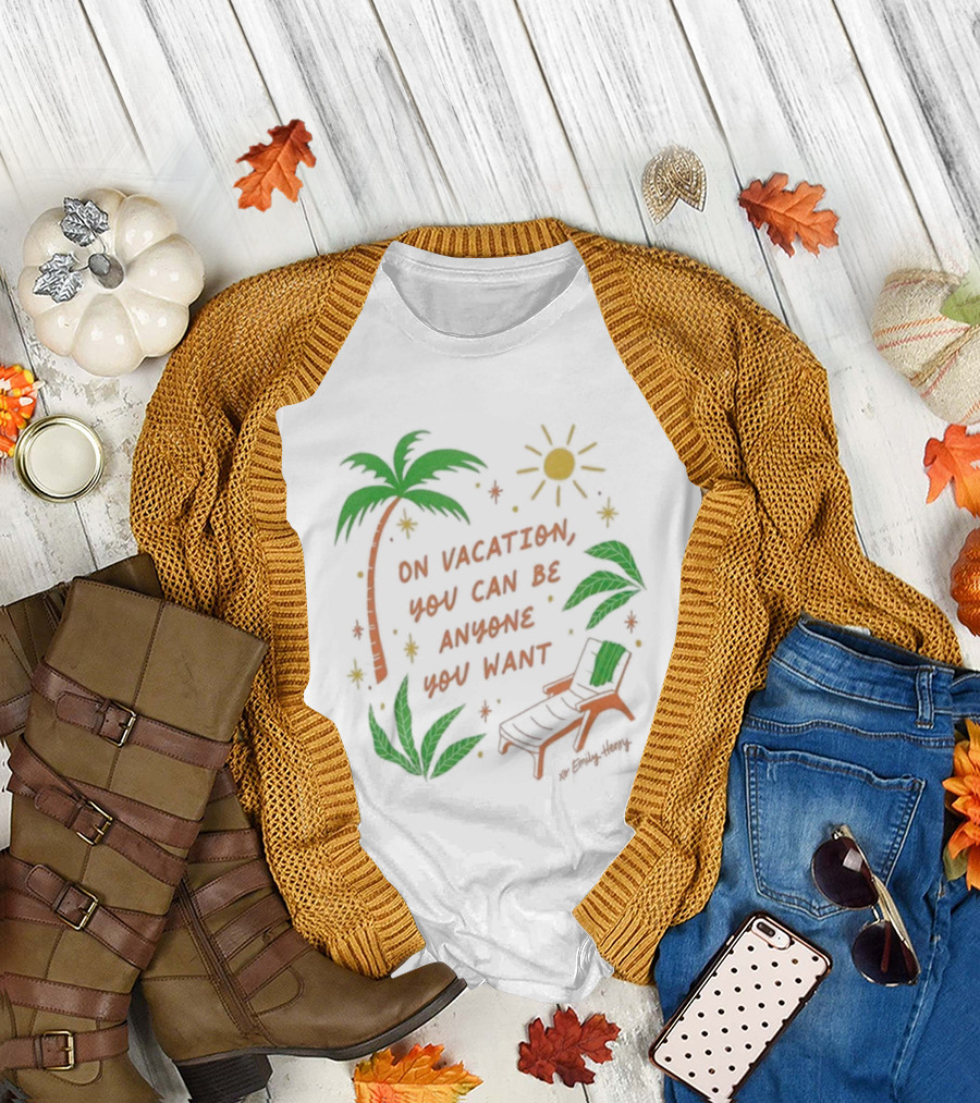 The Emily Henry On Vacation You Can Be Anyone You Want Palm Trees Sun Lounge Chair T-shirt is designed for everyday wear and a consistent fit. Fabric is pre-shrunk ring-spun cotton with durable stitching. See the size chart below for exact measurements.