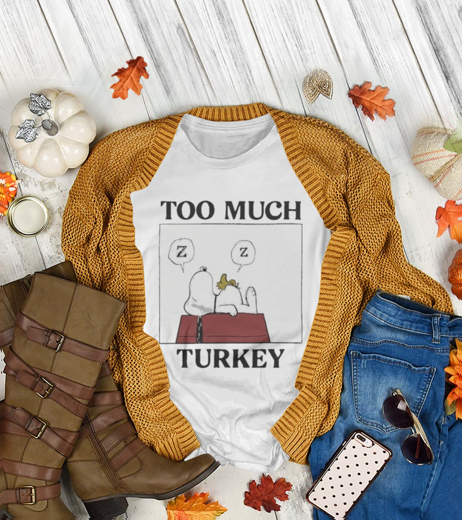 The Too Much Turkey Snoopy Woodstock Thanksgiving Merry Christmas Peanuts Sleeping T-shirt is designed for everyday wear and a consistent fit. Fabric is pre-shrunk ring-spun cotton with durable stitching. See the size chart below for exact measurements.