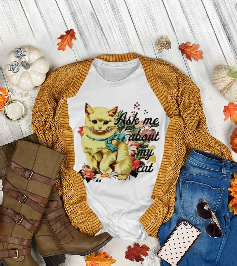 Ask Me About My Cat Vintage Floral Kitten Illustration T-Shirt