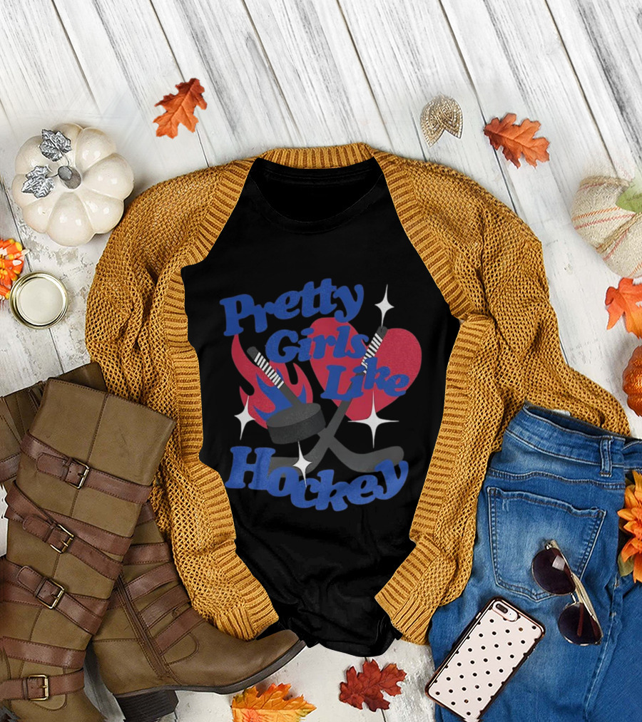 Pretty Girls Like Hockey Sticks And Pucks With Heart And Flames T-Shirt