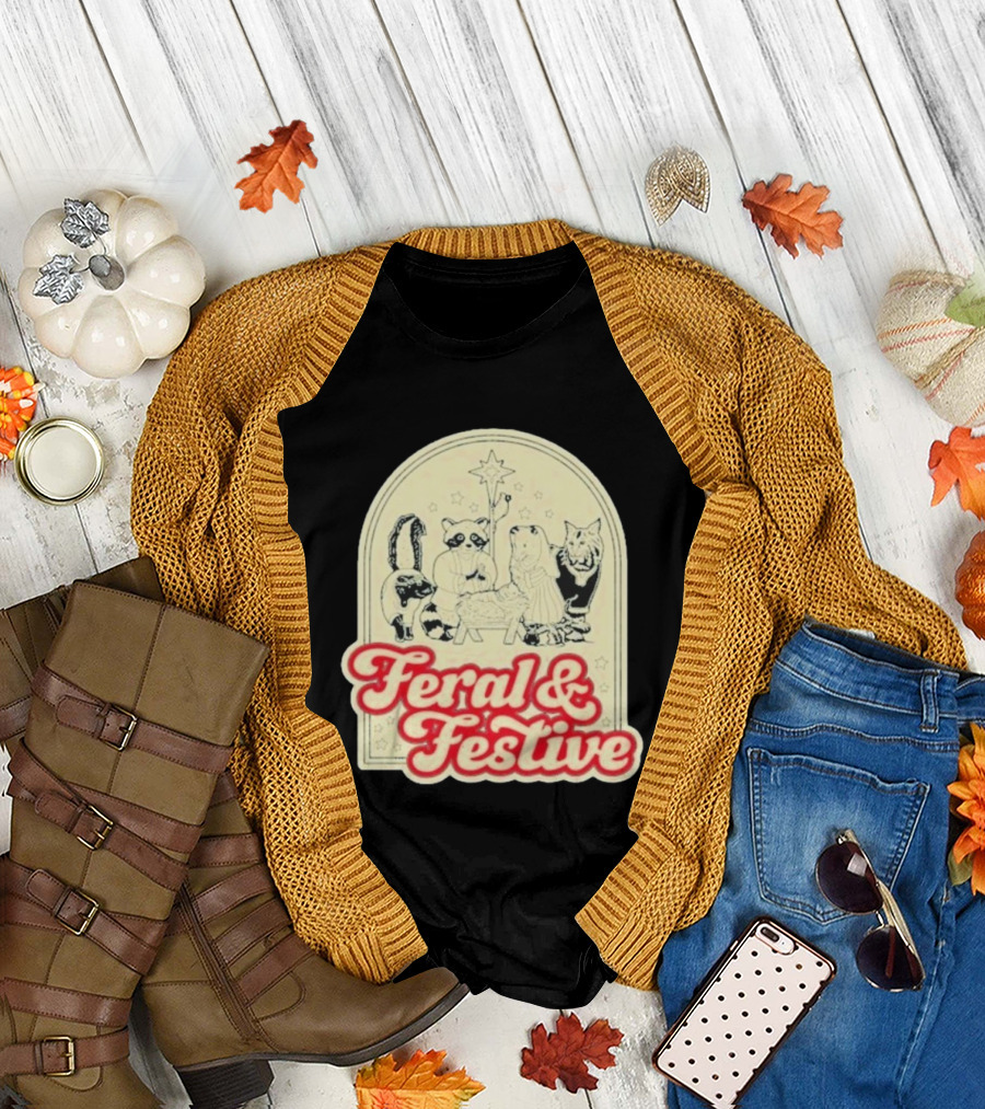 Feral And Festive Animal Nativity Scene Christmas Humor Raccoon Cat Skunk Ensemble T-Shirt
