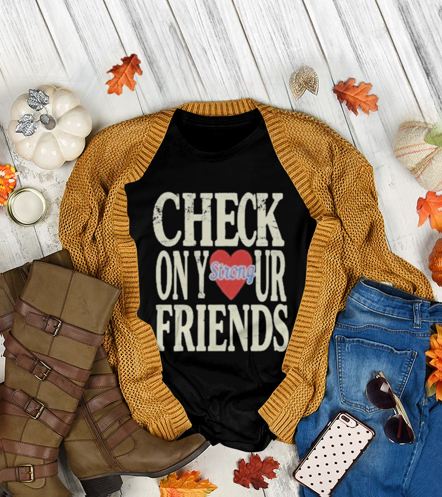 The Check On Your Friends Strong Heart Message T-shirt is designed for everyday wear and a consistent fit. Fabric is pre-shrunk ring-spun cotton with durable stitching. See the size chart below for exact measurements.