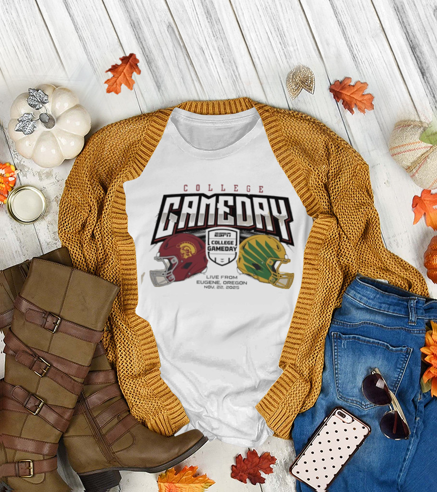 ESPN College GameDay Eugene Oregon Nov 22 2025 USC Trojans Vs Oregon Ducks Helmets T-Shirt