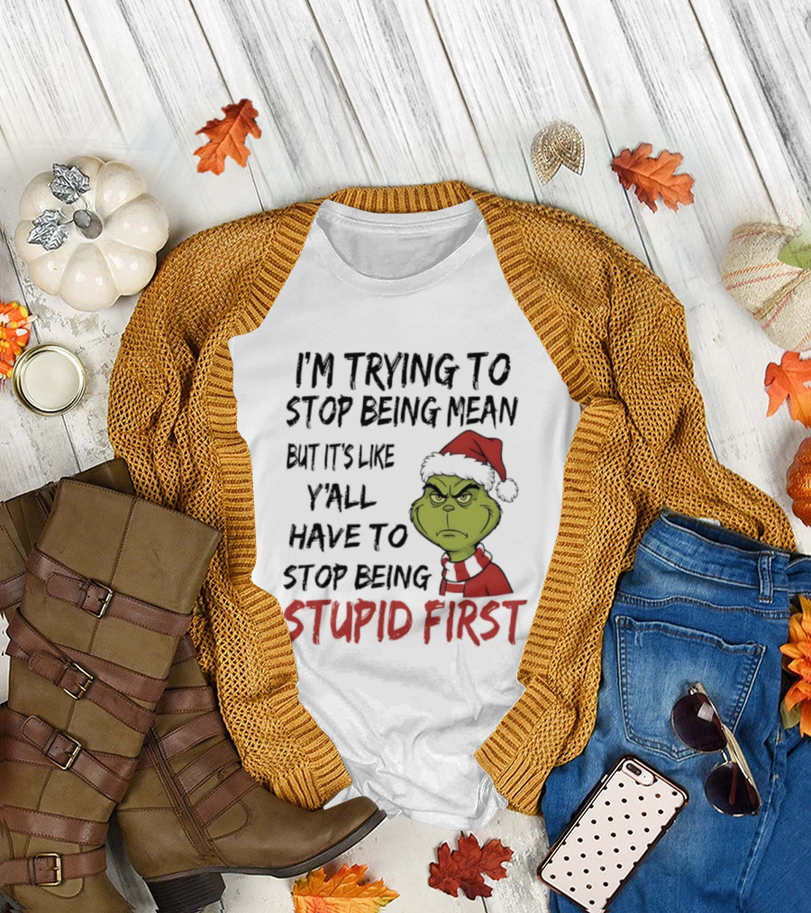 Grinch I'm Trying To Stop Being Mean Santa Hat Stupid First T-Shirt