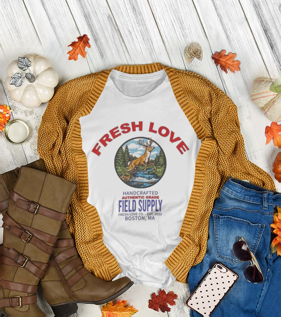 The Fresh Love Handcrafted Authentic Grade Field Supply Boston CA Est 2022 Deer Forest Scene T-shirt is designed for everyday wear and a consistent fit. Fabric is pre-shrunk ring-spun cotton with durable stitching. See the size chart below for exact measurements.