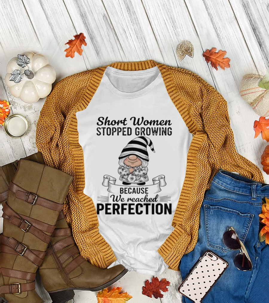 The Short Women Stopped Growing We Reached Perfection Gnome Sweater Striped Hat T-shirt is designed for everyday wear and a consistent fit. Fabric is pre-shrunk ring-spun cotton with durable stitching. See the size chart below for exact measurements.
