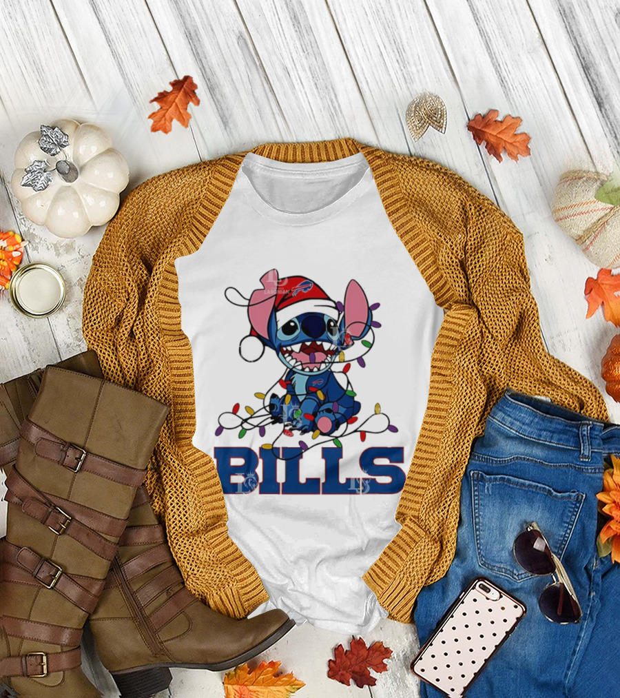 Buffalo Bills Christmas Lights With Stitch In Santa Hat T-Shirt