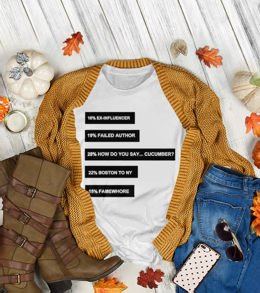 The Percentages Ex Influencer 17% Failed Author Cucumber 37% Bottom Text 10% Sales Quotation T-shirt is designed for everyday wear and a consistent fit. Fabric is pre-shrunk ring-spun cotton with durable stitching. See the size chart below for exact measurements.