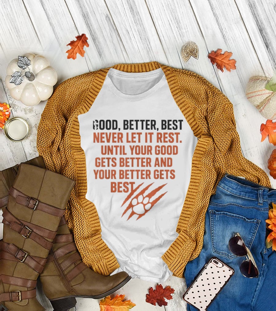 Good Better Best Never Let It Rest Until Your Good Gets Better and Your Better Gets Best T-shirt — styled flat-lay, front print.
