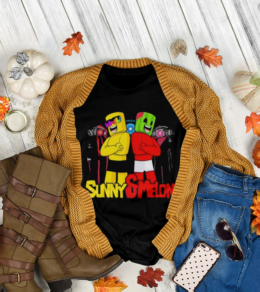 The Sunny And Melon The Duo Colorful Block Characters with Shades and Caps T-shirt is designed for everyday wear and a consistent fit. Fabric is pre-shrunk ring-spun cotton with durable stitching. See the size chart below for exact measurements.