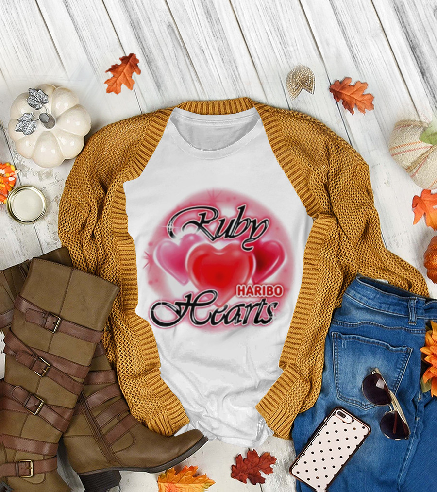 The Jennie X Haribo Ruby Hearts T-shirt is designed for everyday wear and a consistent fit. Fabric is pre-shrunk ring-spun cotton with durable stitching. See the size chart below for exact measurements.