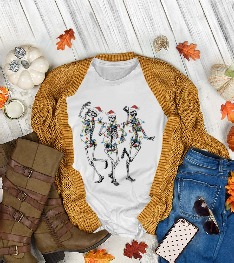 Skeletons Dancing Santa Hats Christmas Lights Holiday Fun T-Shirt