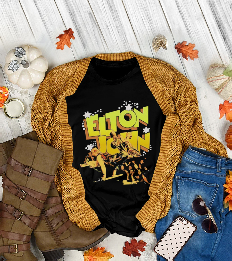 The Elton John Live Performance Stars Retro Style T-shirt is designed for everyday wear and a consistent fit. Fabric is pre-shrunk ring-spun cotton with durable stitching. See the size chart below for exact measurements.