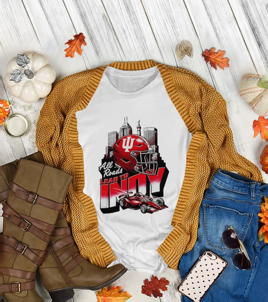 Indiana Hoosiers All Roads Lead To Indy Football Helmet Racing Car City Skyline T-Shirt