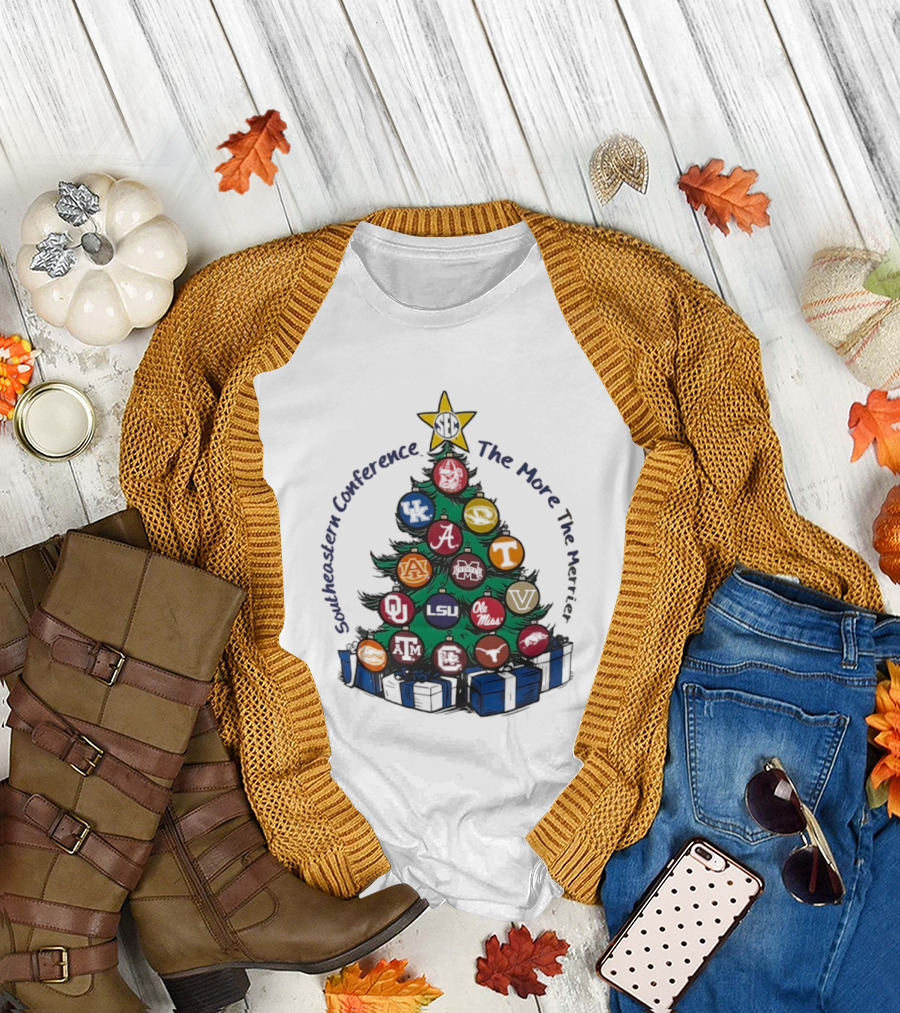 SEC Southeastern Conference The More The Merrier Christmas Tree With Team Ornaments T-Shirt