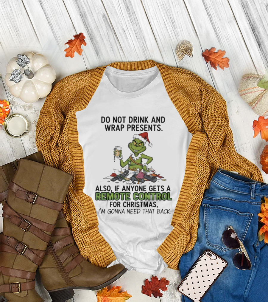 Grinch Do Not Drink And Wrap Presents Also If Anyone Gets A Remote Control For Christmas I'm Gonna Need That Back T-Shirt