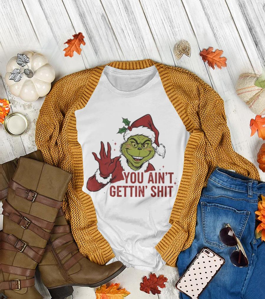 Grinch You Ain't Gettin' Shit With Santa Hat And Holly T-Shirt