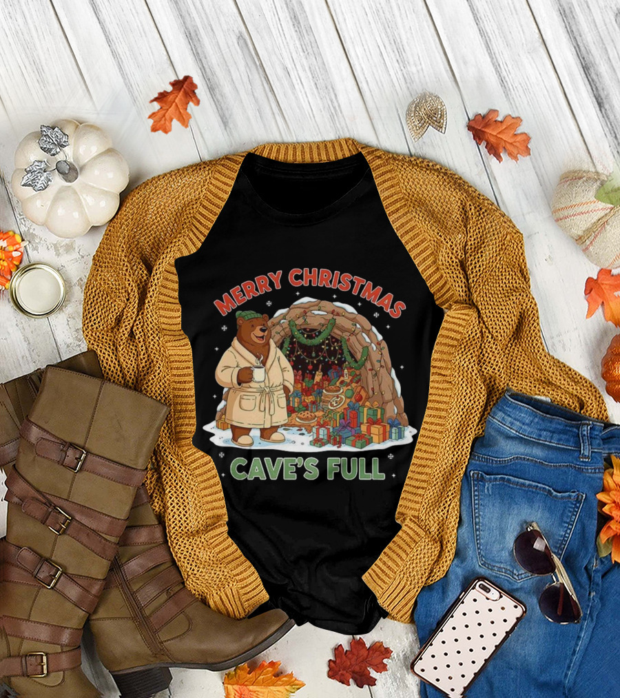 Merry Christmas Bear In Cozy Cave Filled With Gifts T-Shirt
