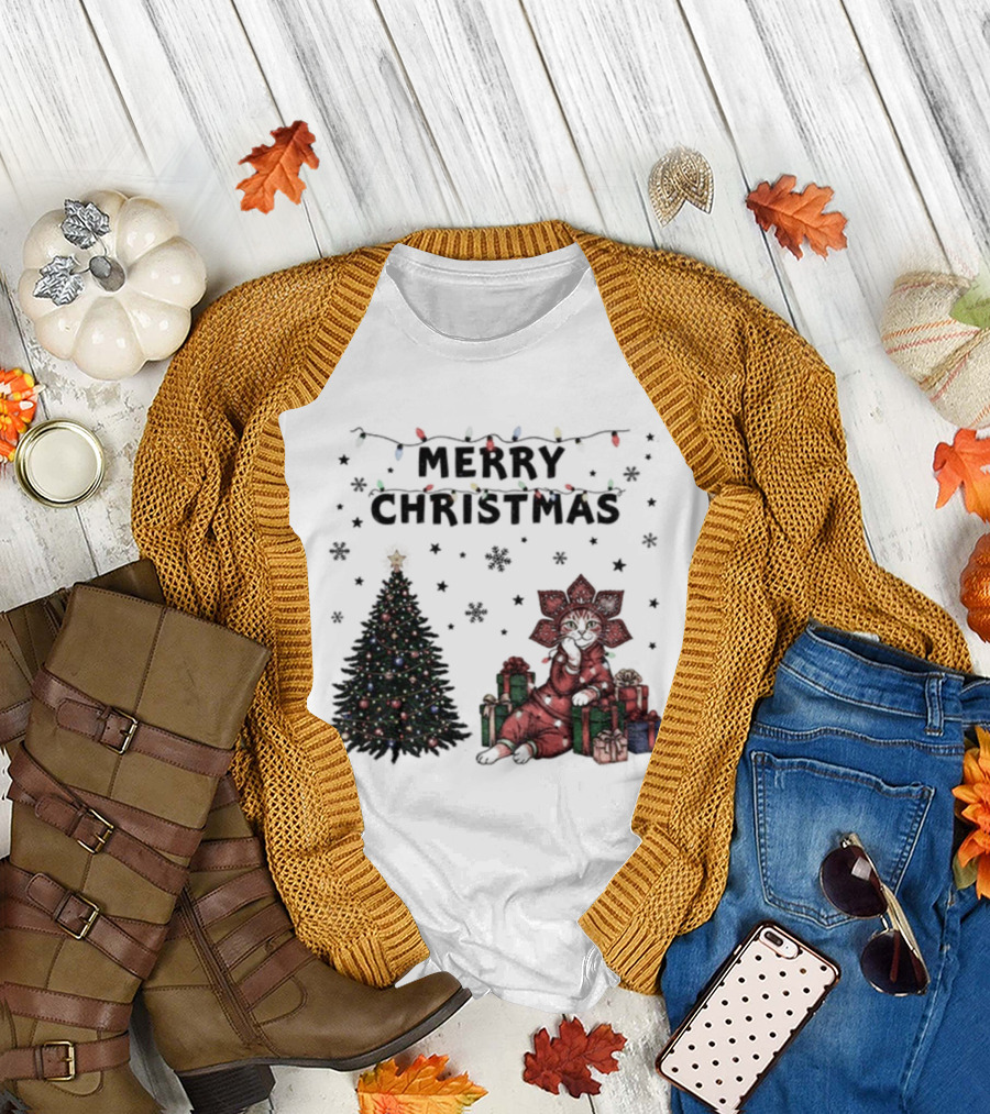 Cute Cat With Gifts Christmas Tree Lights Merry Christmas T-Shirt