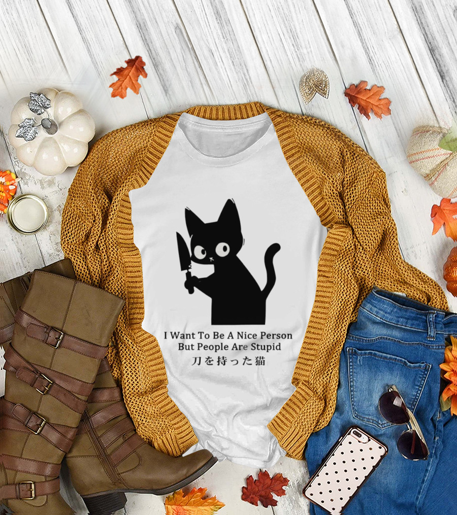 Black Cat With Knife Japan I Want To Be A Nice Person But People Are Stupid T-Shirt