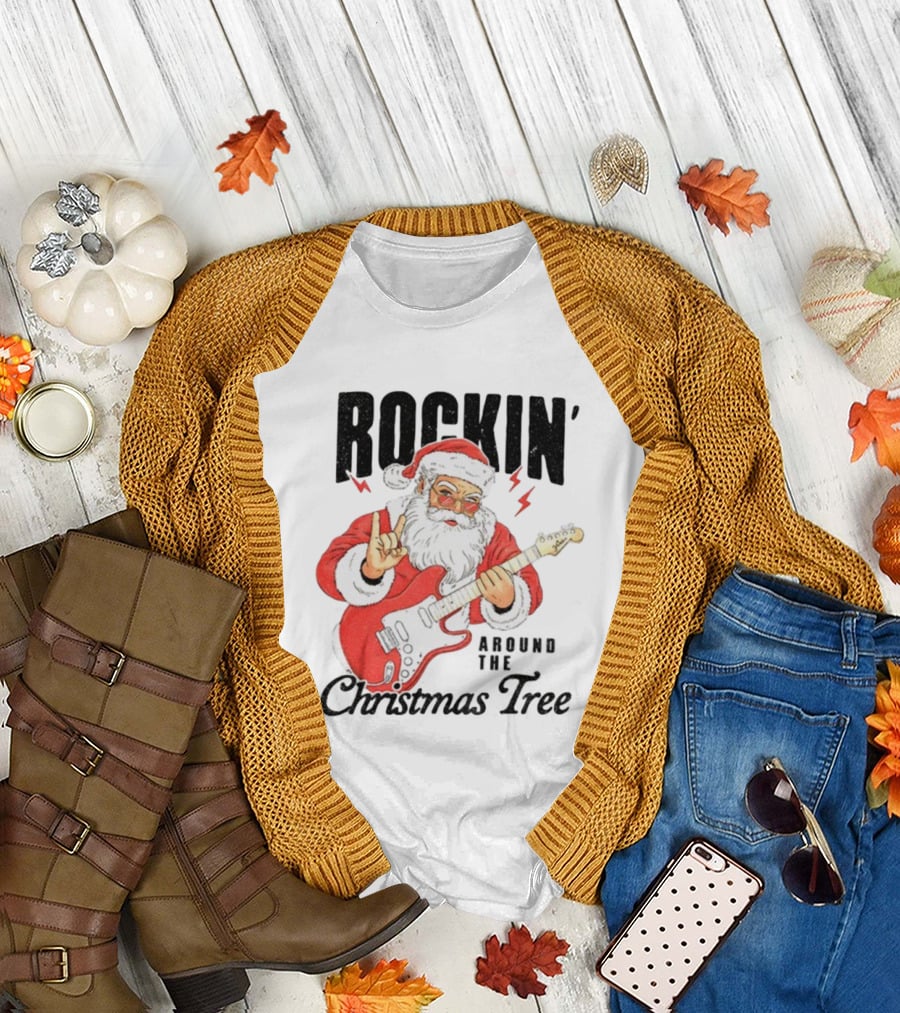 Rockin' Santa Claus Playing Guitar Around The Christmas Tree Merry Christmas T-Shirt