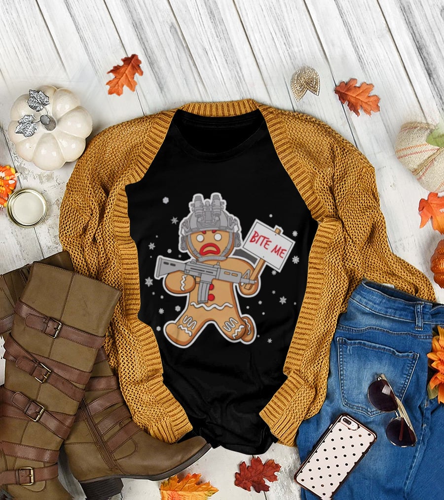 Bite Me Hostile Gingerbread Soldier Holding Sign With Weapon And Helmet T-Shirt