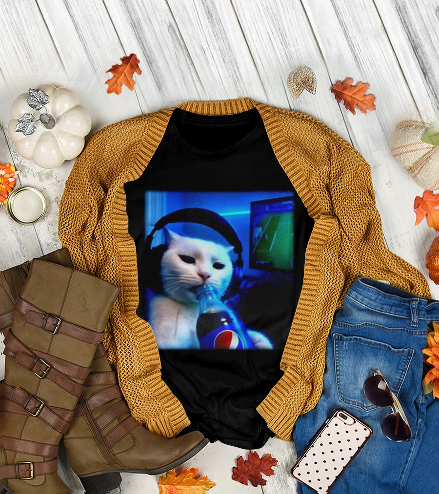 Cat Wearing Headphones Drinking Pepsi Gaming Meme T-Shirt