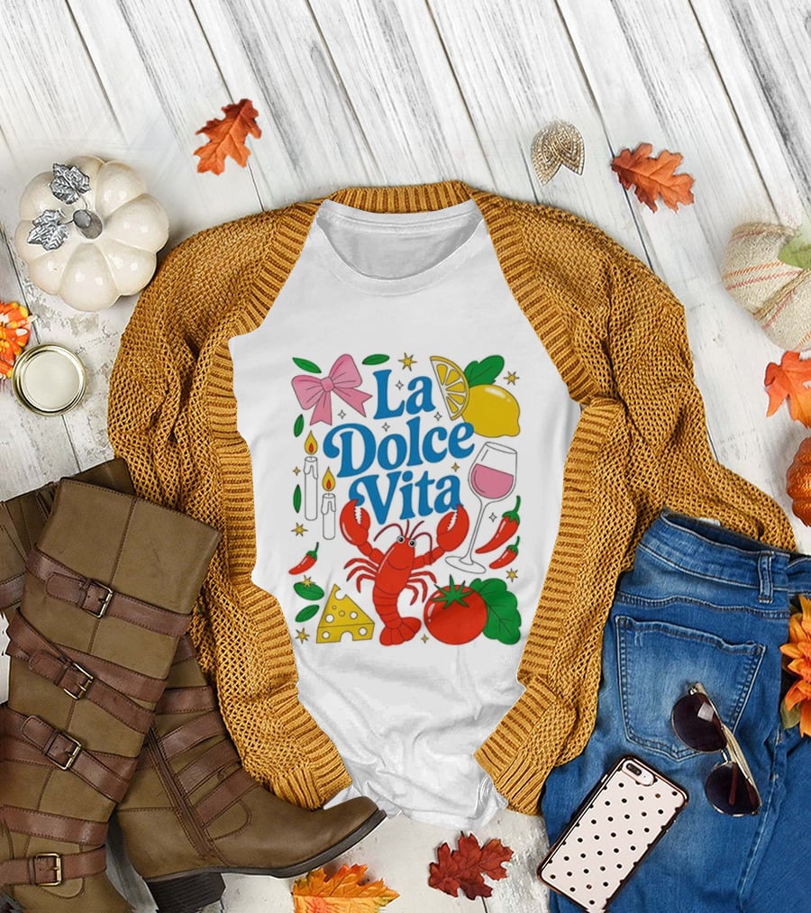 The J’aime La Dolce Vita Lobster Lemon Tomato Cheese Bow Candles Wine Peppers T-shirt is designed for everyday wear and a consistent fit. Fabric is pre-shrunk ring-spun cotton with durable stitching. See the size chart below for exact measurements.