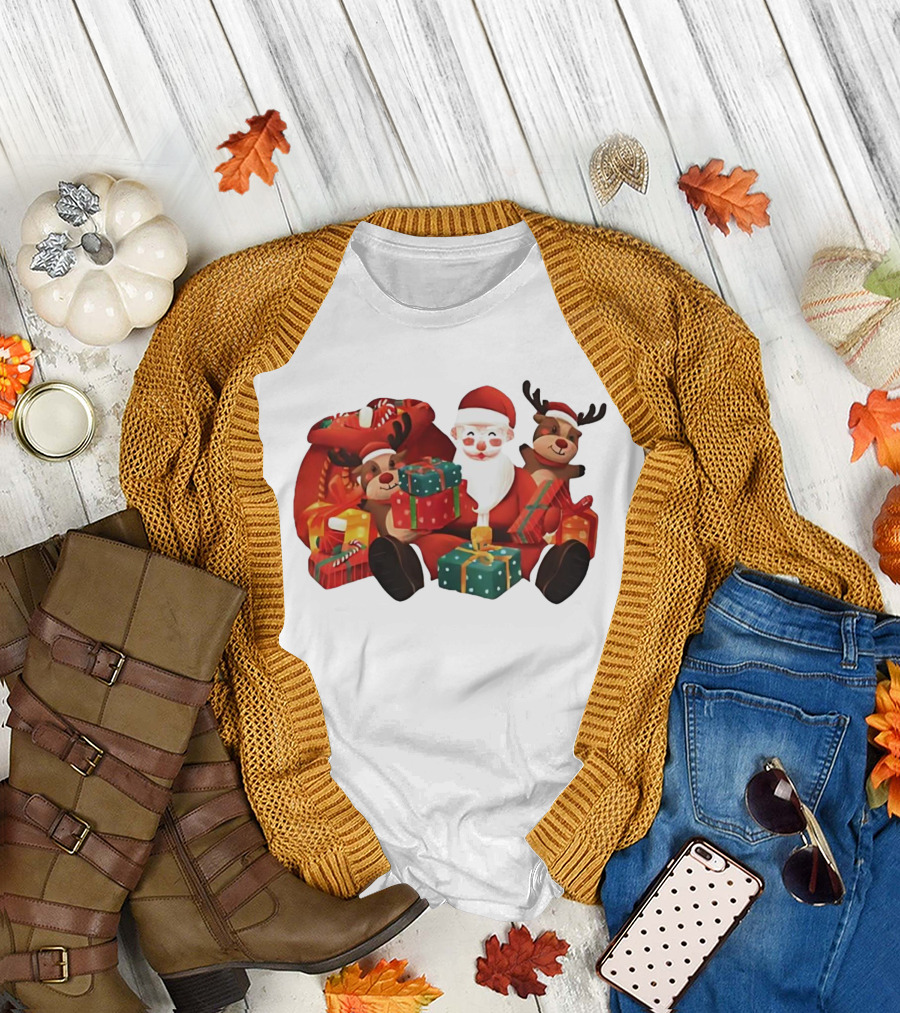 Santa Claus And Reindeer Holding Christmas Gifts With Sack And Ribbon T-Shirt