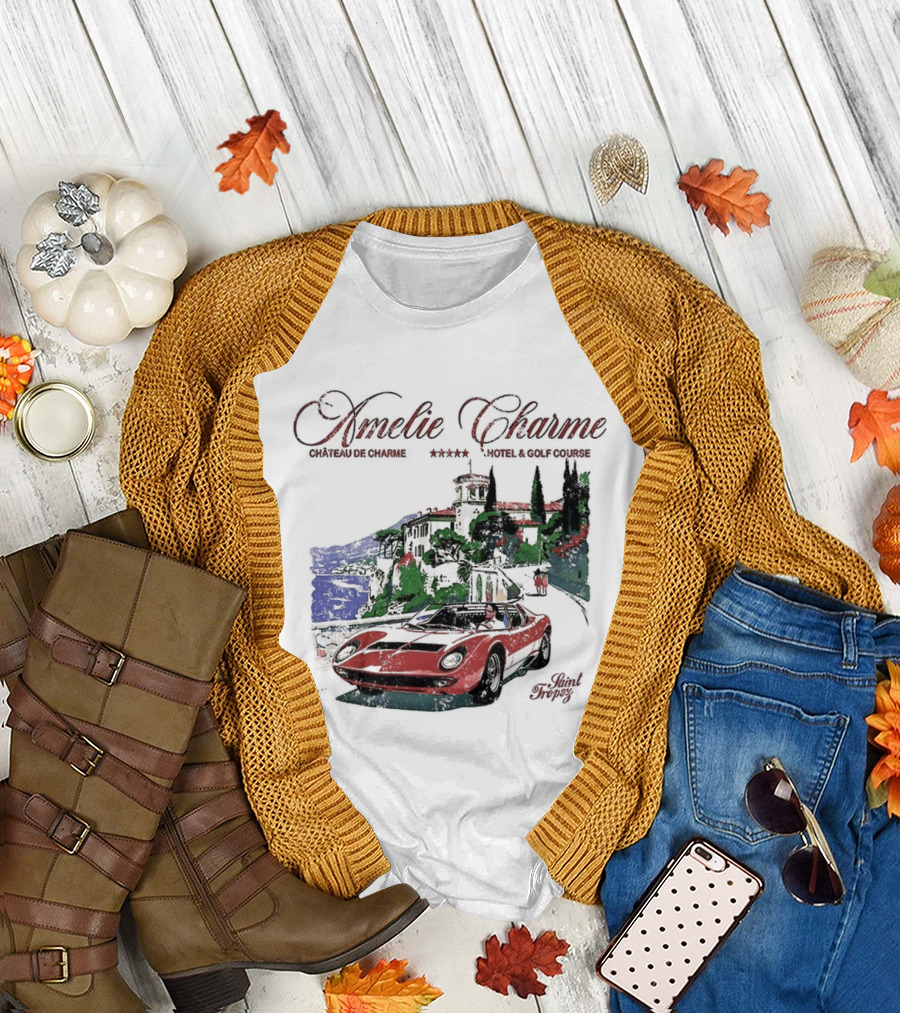 The Amelie Charme Chateau du Charme Saint Tropez Hotel and Golf Course Vintage Car Scenic T-shirt is designed for everyday wear and a consistent fit. Fabric is pre-shrunk ring-spun cotton with durable stitching. See the size chart below for exact measurements.