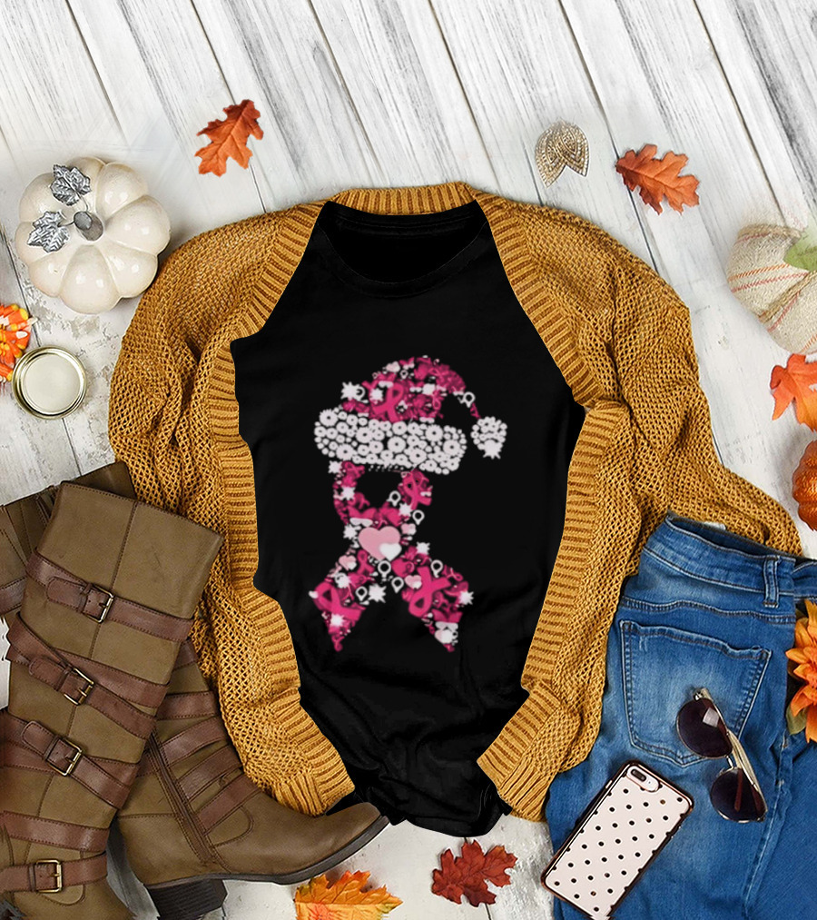 Santa Hat Breast Cancer Awareness Christmas Ribbon T-Shirt