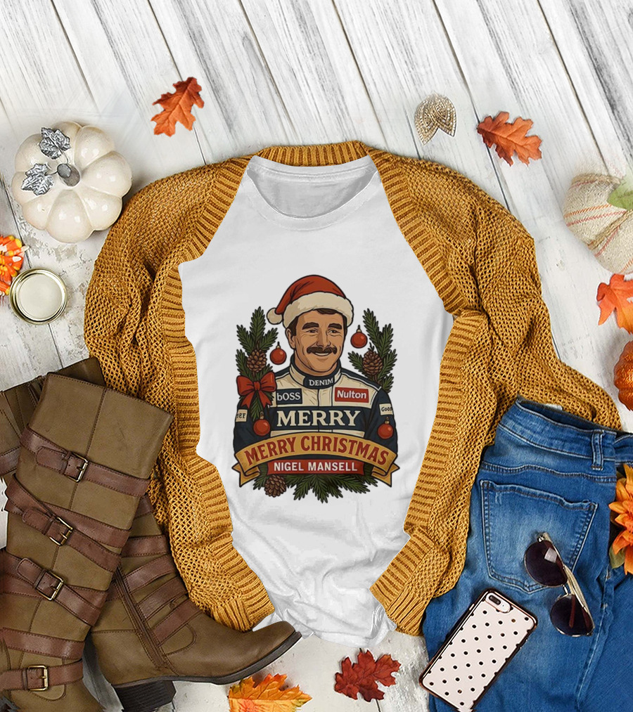 Nigel Mansell Merry Christmas Boss Denim Nulton Goodyear Racing Santa Hat Pinecones T-Shirt