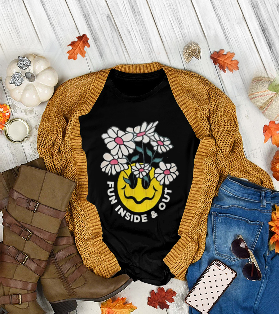 The Fun Inside and Out Yellow Smiley Face with Daisies T-shirt is designed for everyday wear and a consistent fit. Fabric is pre-shrunk ring-spun cotton with durable stitching. See the size chart below for exact measurements.