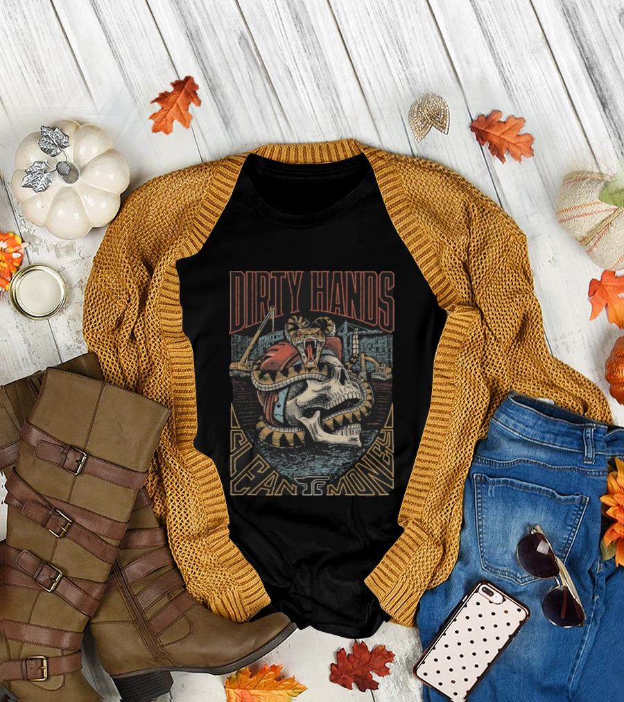 The Dirty Hands Clean Money Skull with Construction Crane and Snake T-shirt is designed for everyday wear and a consistent fit. Fabric is pre-shrunk ring-spun cotton with durable stitching. See the size chart below for exact measurements.