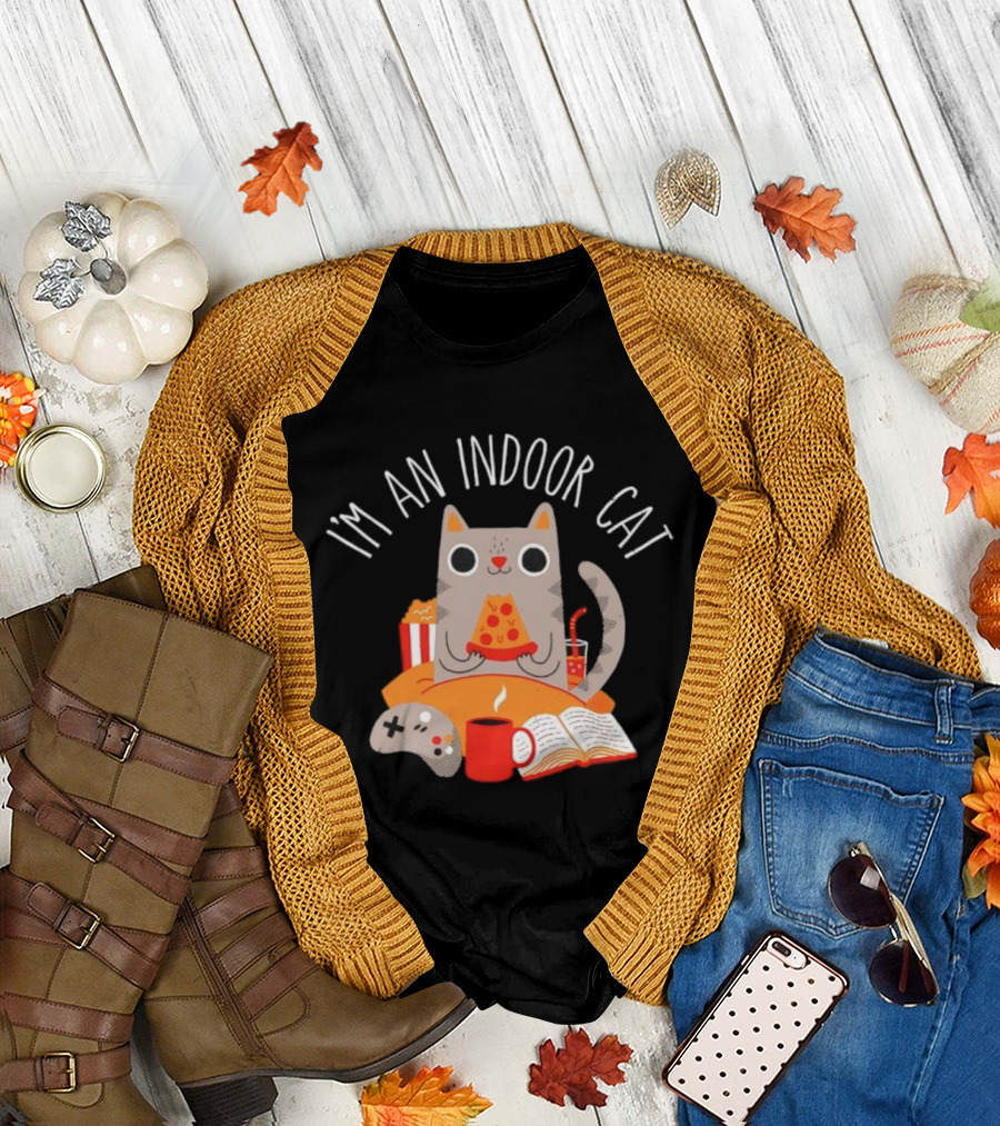 The I'm an Indoor Cat Cartoon Cozy Vibes with Pizza, Popcorn, and Video Game Controller T-shirt is designed for everyday wear and a consistent fit. Fabric is pre-shrunk ring-spun cotton with durable stitching. See the size chart below for exact measurements.