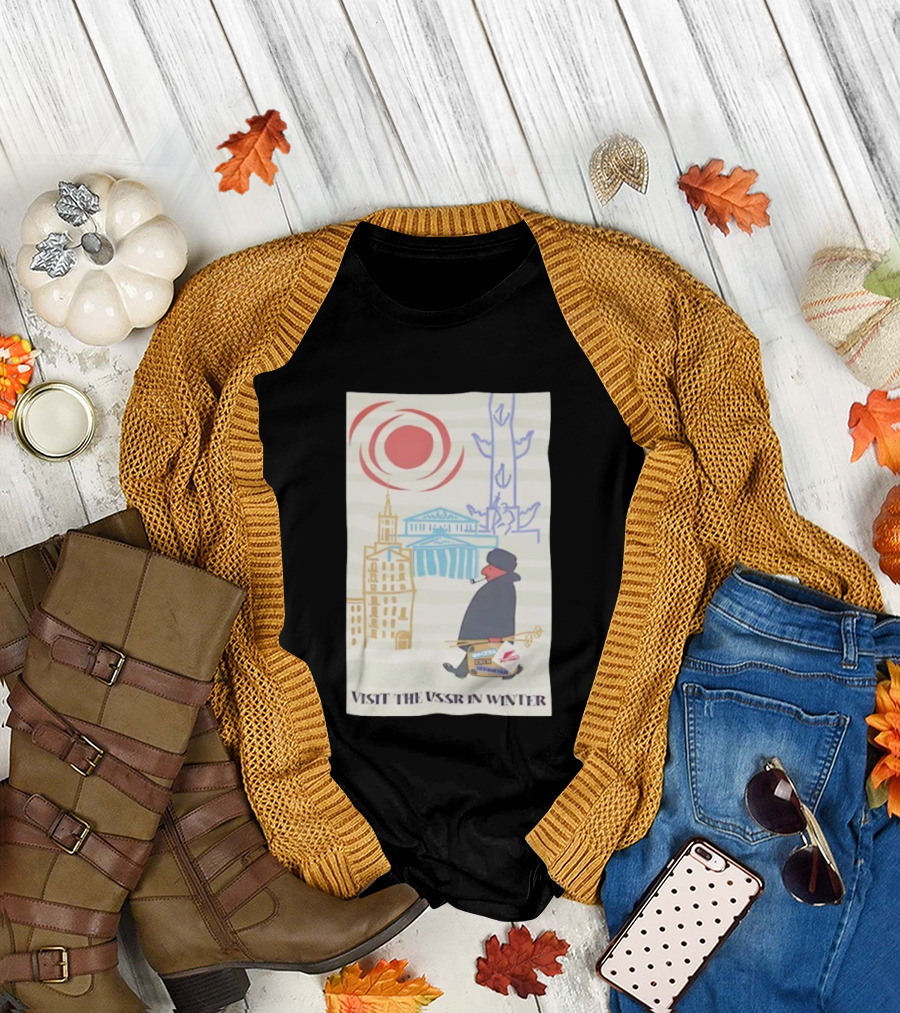 Visit The USSR In Winter Soviet Travel Propaganda Red Sun Russian Buildings Holiday Promotion T-Shirt