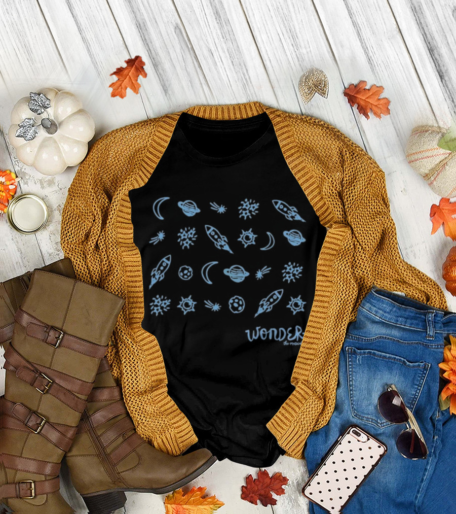 The Wonder Icons Celestial Blue Stars and Moon Pattern T-shirt is designed for everyday wear and a consistent fit. Fabric is pre-shrunk ring-spun cotton with durable stitching. See the size chart below for exact measurements.