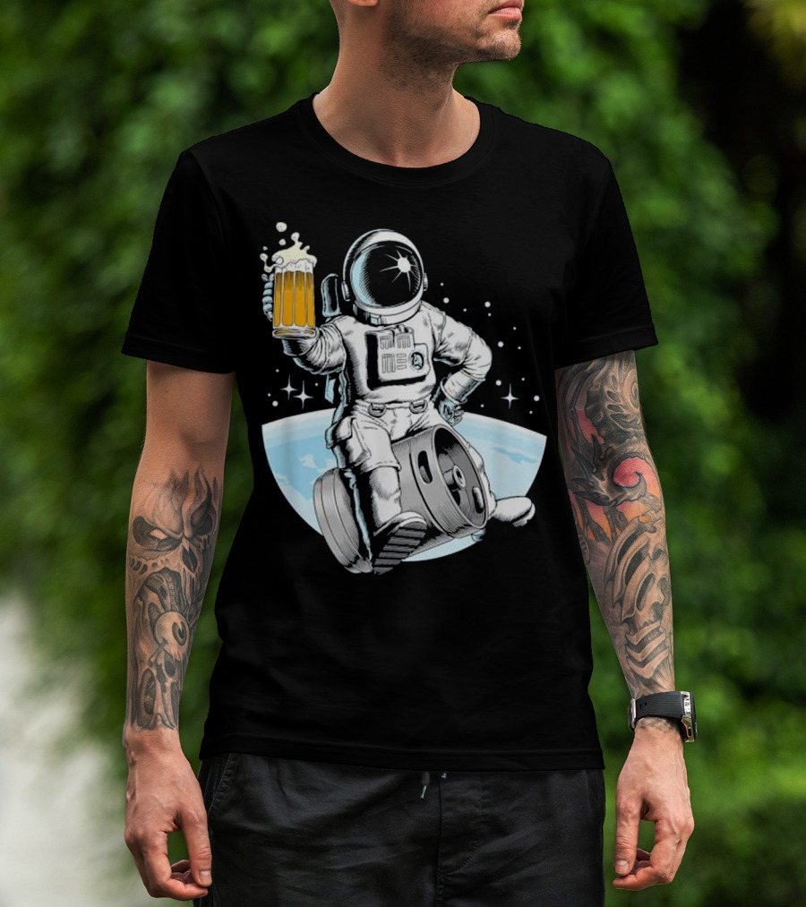Beer Drinking Astronaut Holding A Mug Of Beer In Space With Stars And Earth Background T-Shirt