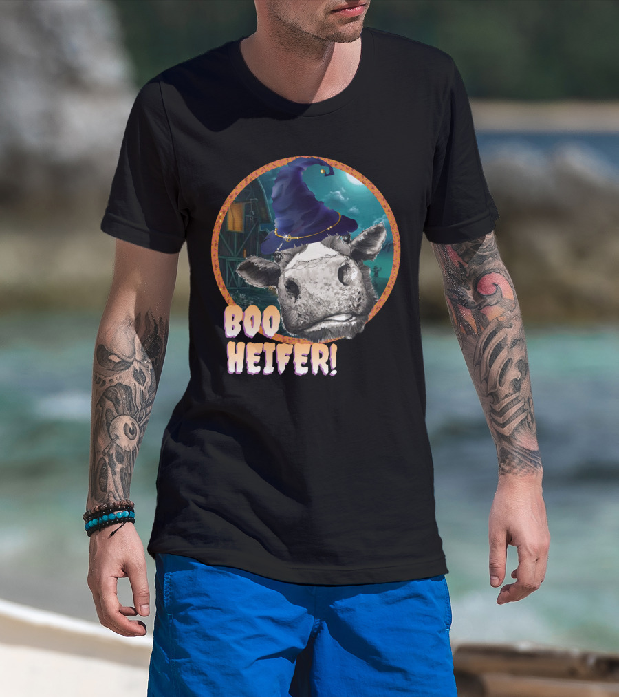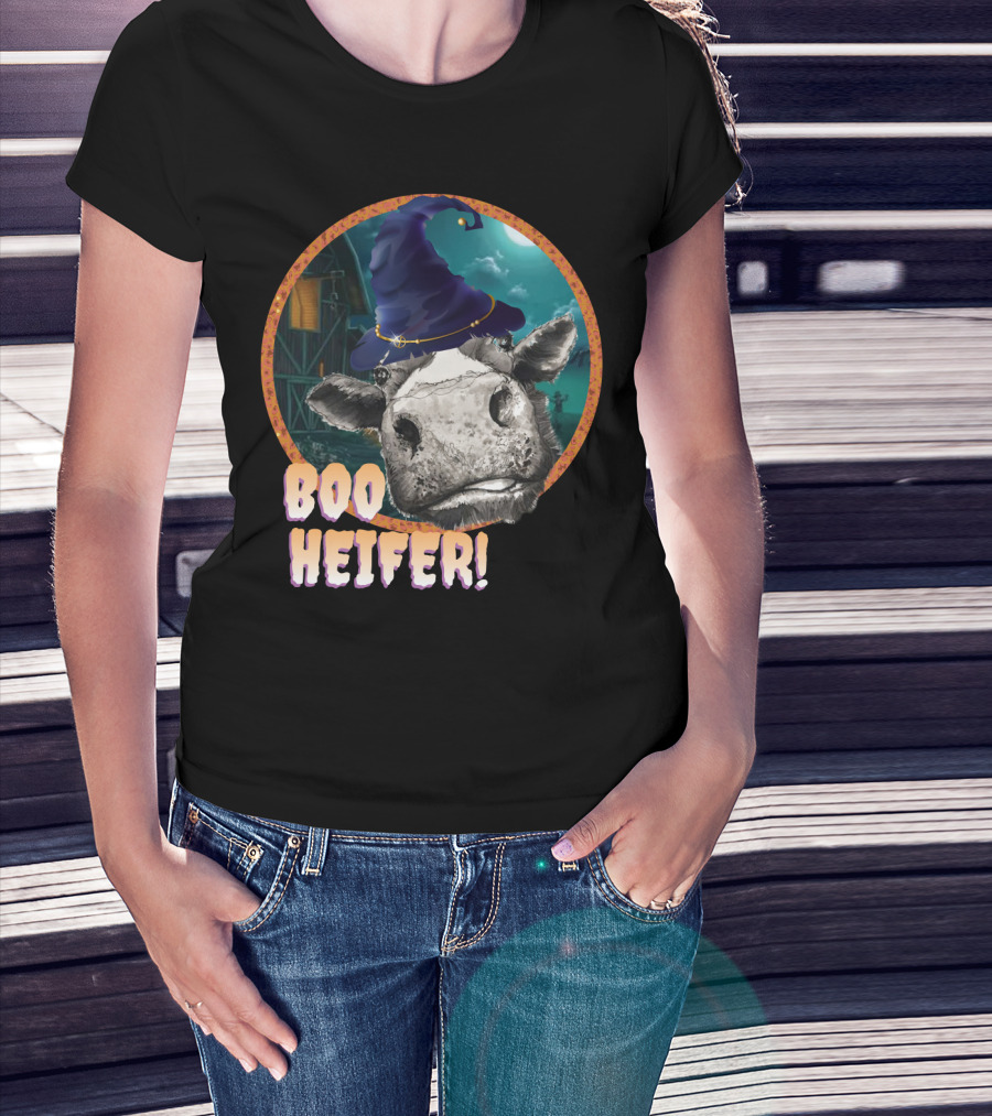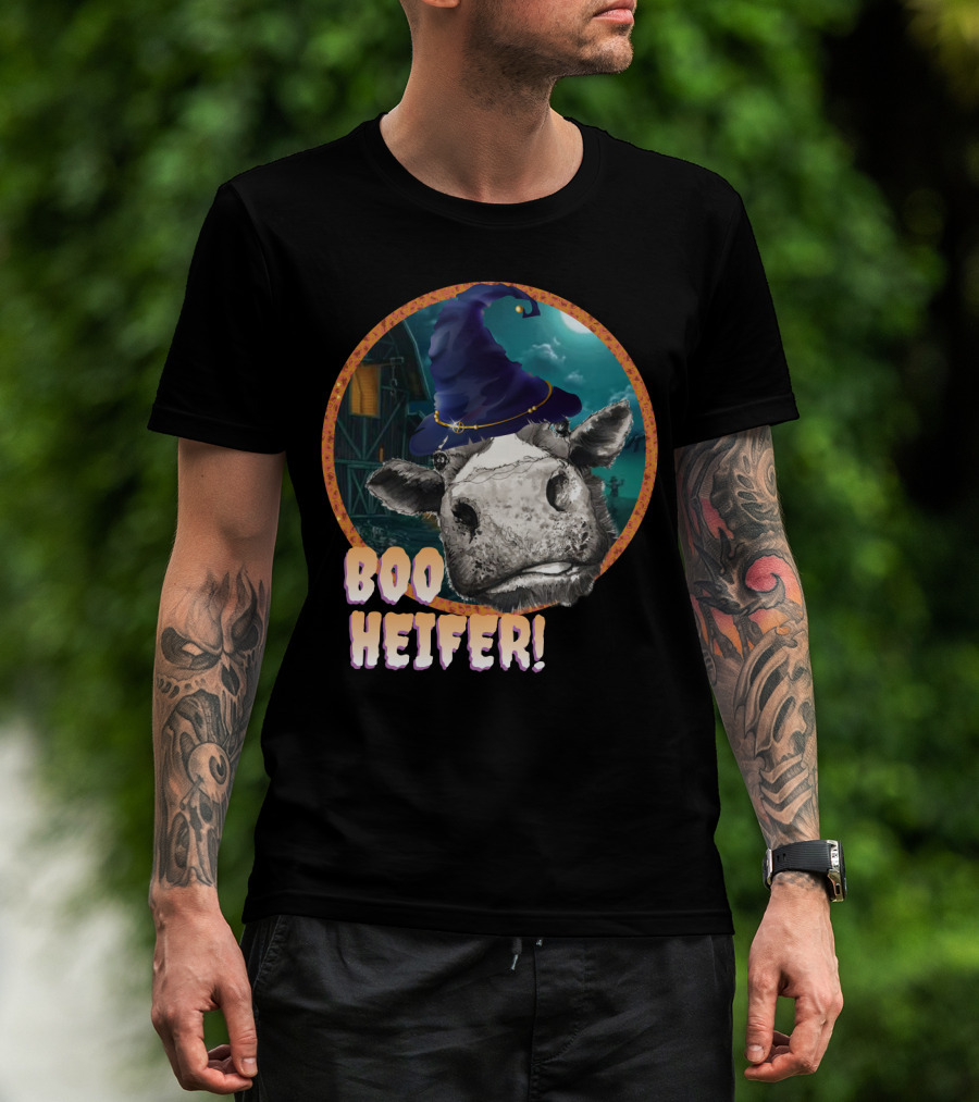 Boo Heifer Funny Halloween Cow Witch Farmer Lady With Hat And Farm Background T-Shirt