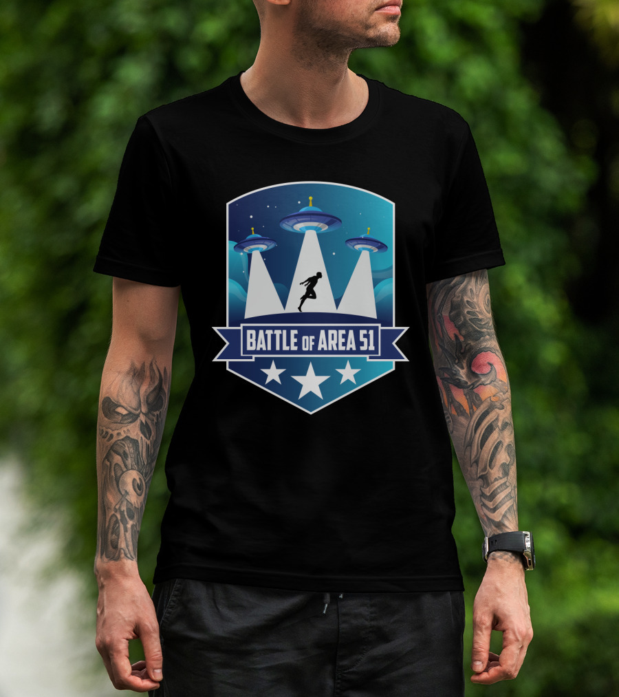 The Battle Of Area 51 UFOs Funny Ninja Running Under Spaceship Lights T-shirt is designed for everyday wear and a consistent fit. Fabric is pre-shrunk ring-spun cotton with durable stitching. See the size chart below for exact measurements.
