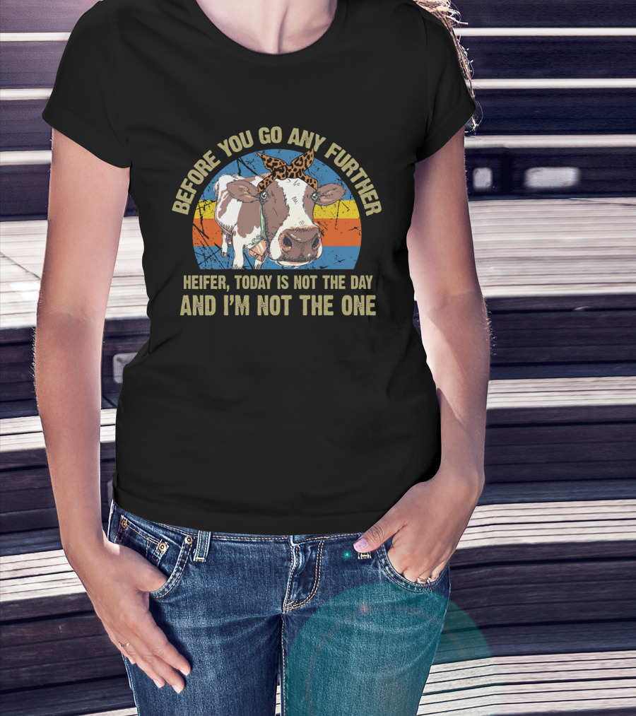 The Before You Go Any Further Heifer Cow Today Is Not The Day And I'm Not The One T-shirt is designed for everyday wear and a consistent fit. Fabric is pre-shrunk ring-spun cotton with durable stitching. See the size chart below for exact measurements.