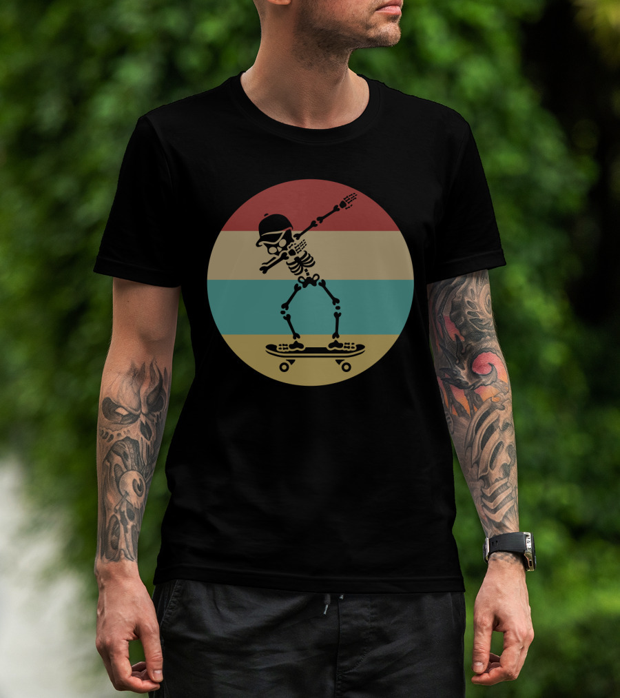 The Dabbing Skeleton Skateboarder Retro Stripes Vintage Sunset T-shirt is designed for everyday wear and a consistent fit. Fabric is pre-shrunk ring-spun cotton with durable stitching. See the size chart below for exact measurements.