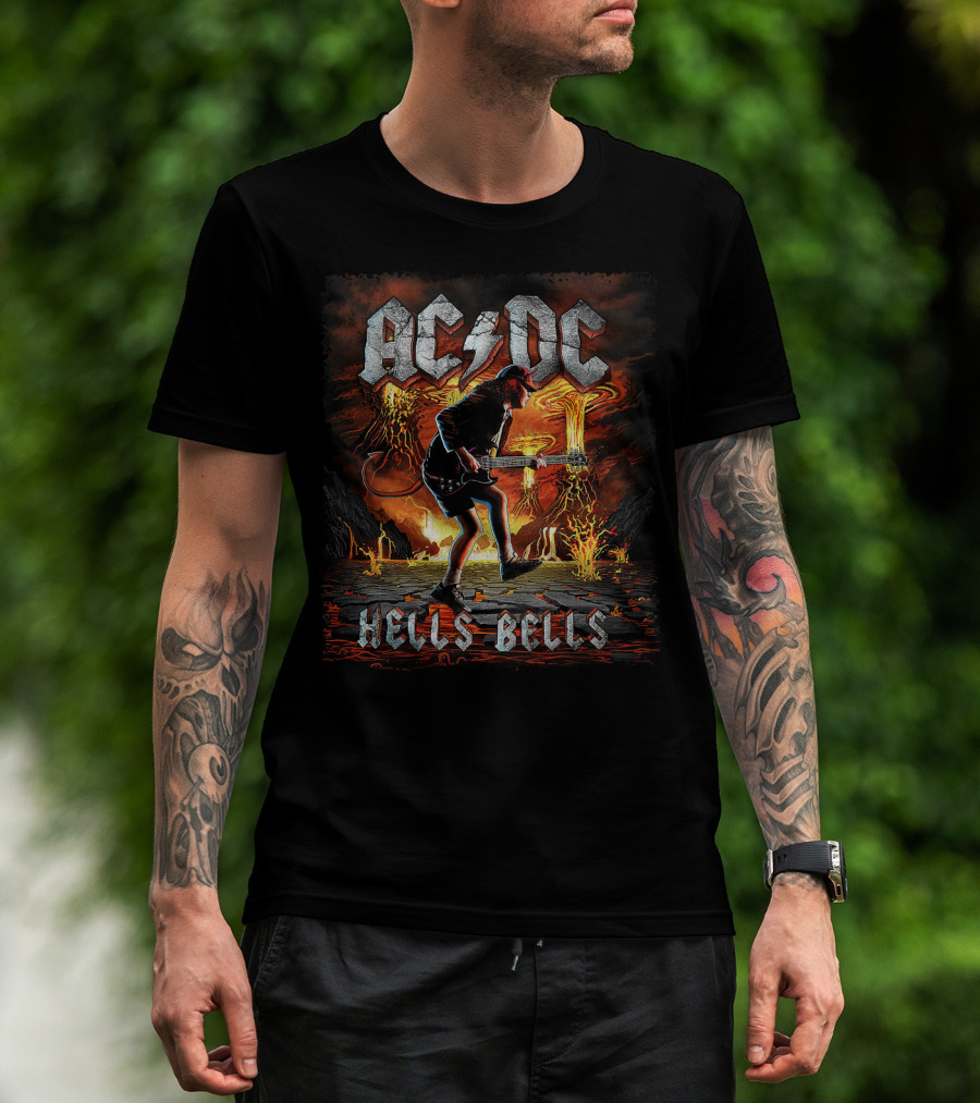 The AC/DC Hells Bells Guitarist with Volcanic Eruption Background T-shirt is designed for everyday wear and a consistent fit. Fabric is pre-shrunk ring-spun cotton with durable stitching. See the size chart below for exact measurements.