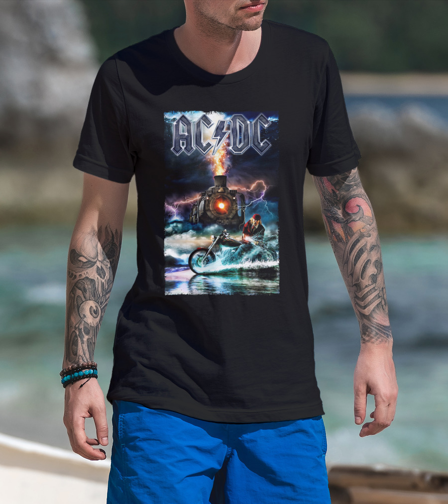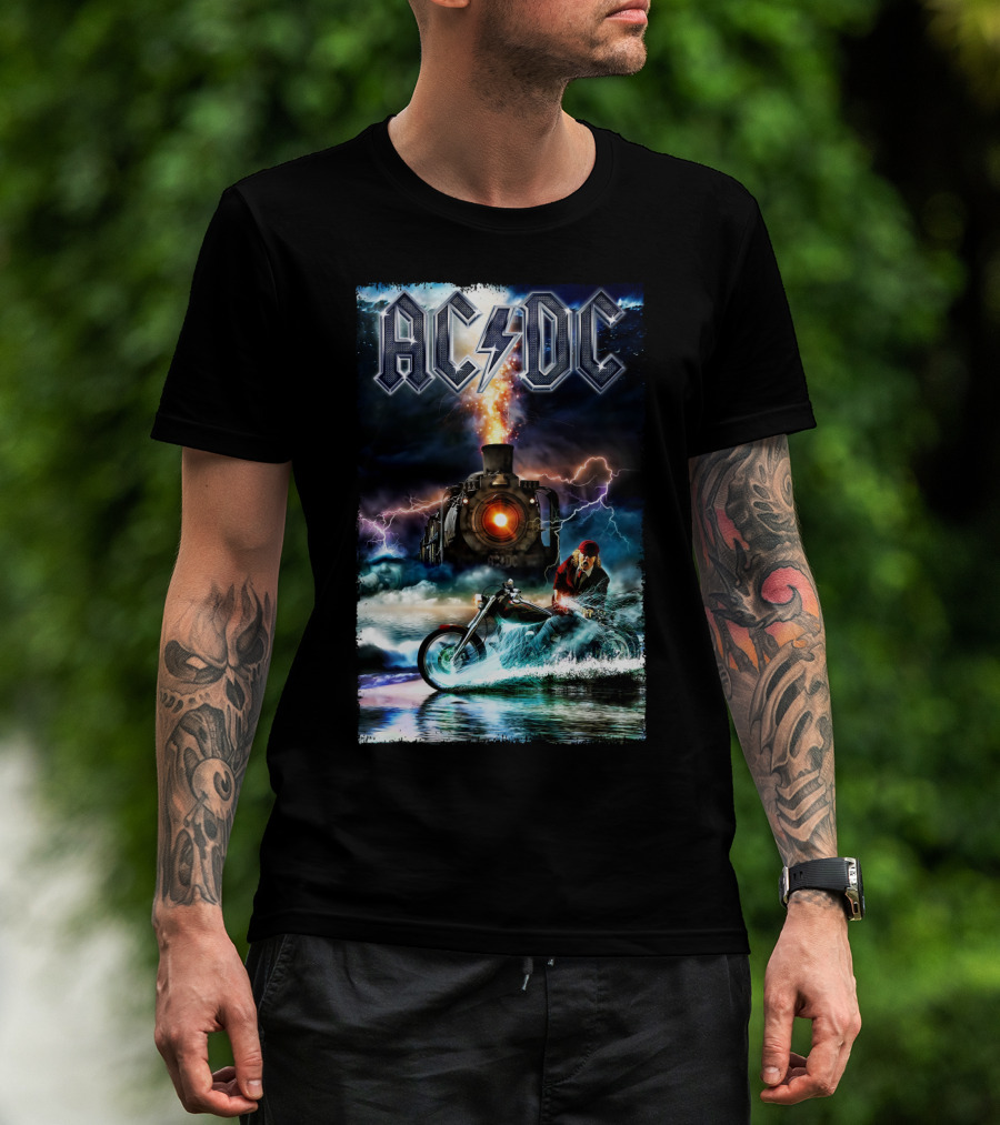 AC/DC Rock And Roll Train With Lightning And Motorbike Scene T-Shirt
